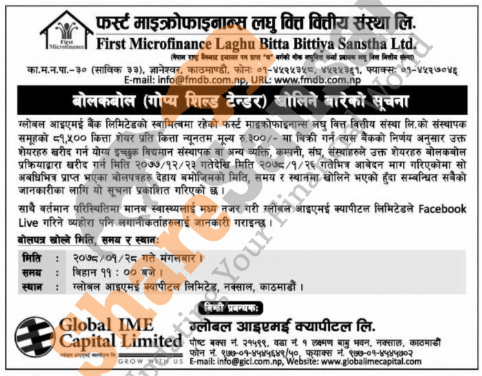 Global IME Bank Limited has published notice regarding bid opening date of its 81,500 units promoter shares of (First Microfinance Laghubitta Bittiya Sanstha Limited) in an auction to the general public on 28th Baisakh,2078(today).