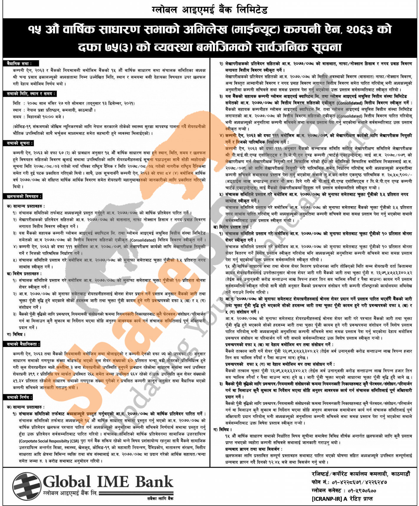 Global IME Bank Limited has published the minutes of its 15th Annual General Meeting (AGM).