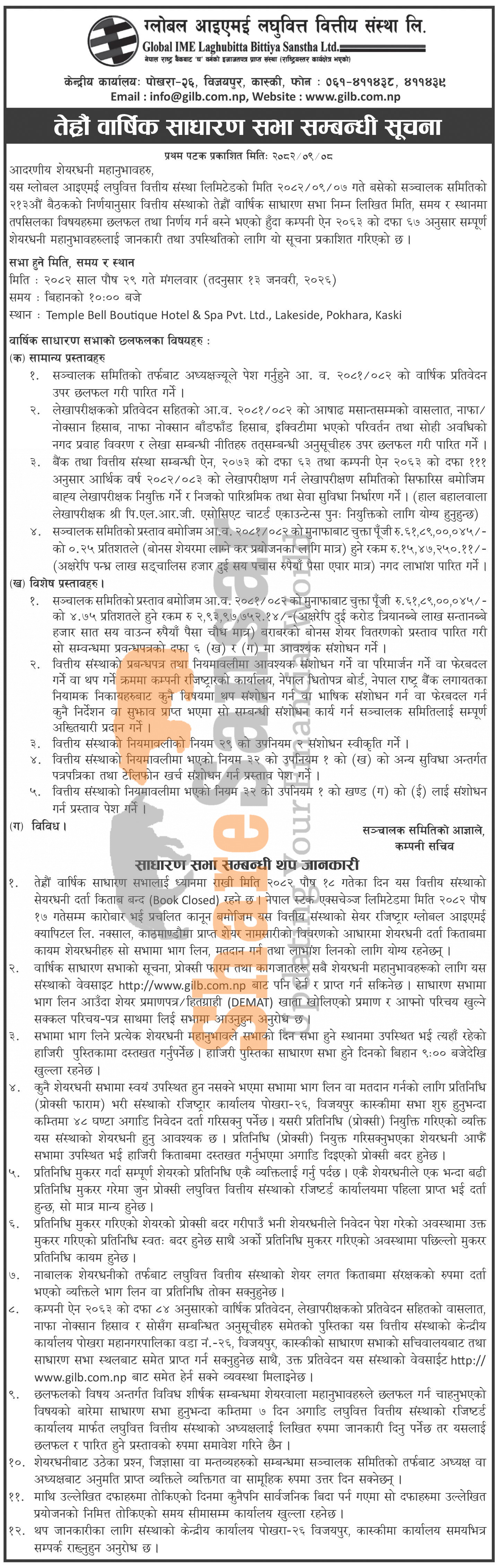 Global IME Laghubitta Bittiya Sanstha Limited has announced its 13th AGM going to be held on 29th Poush, 2082.
