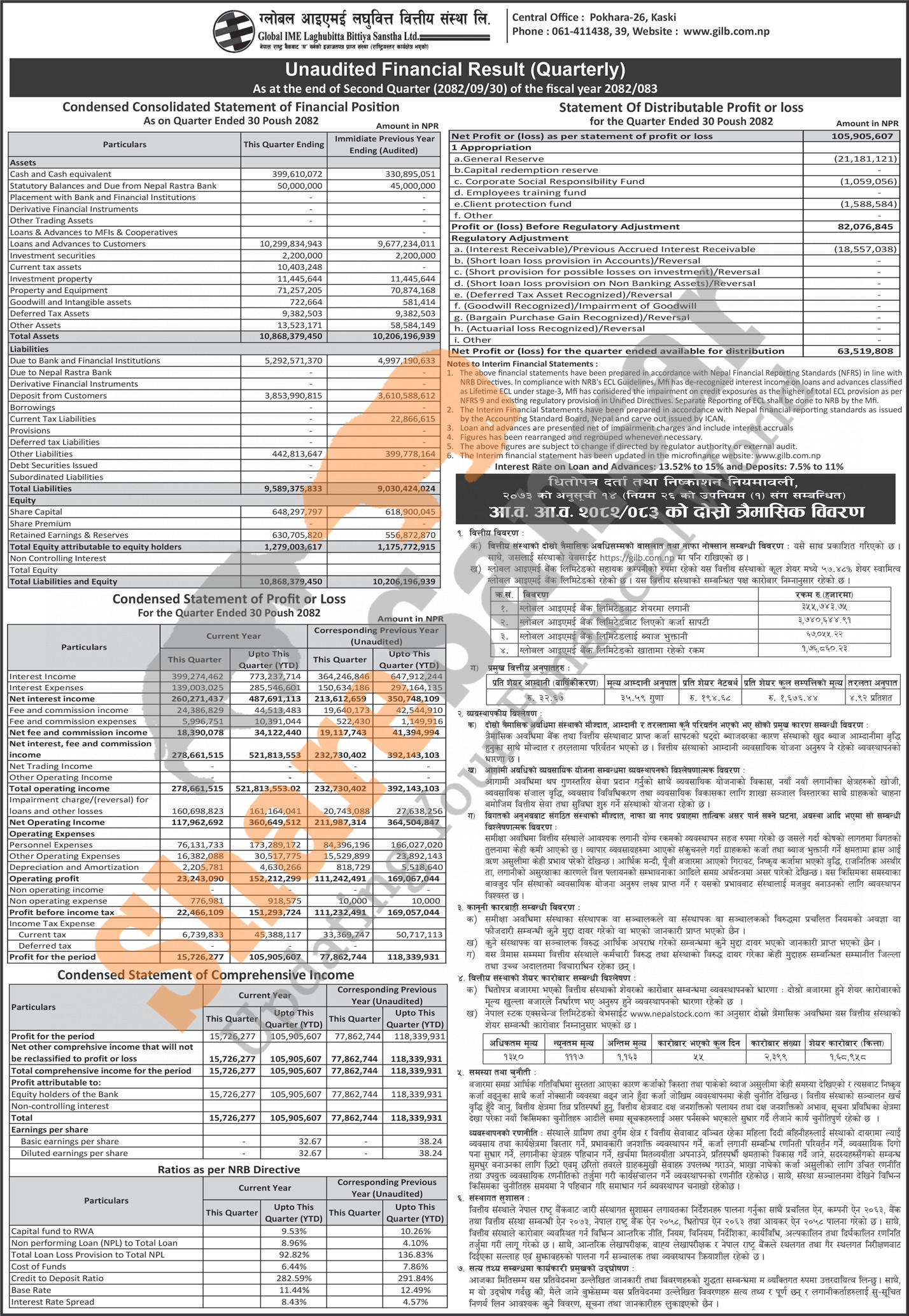 Global IME Laghubitta Bittiya Sanstha Limited has posted a net profit of Rs 105.90 million and published its 2nd quarter company analysis of the fiscal year 2082/83.