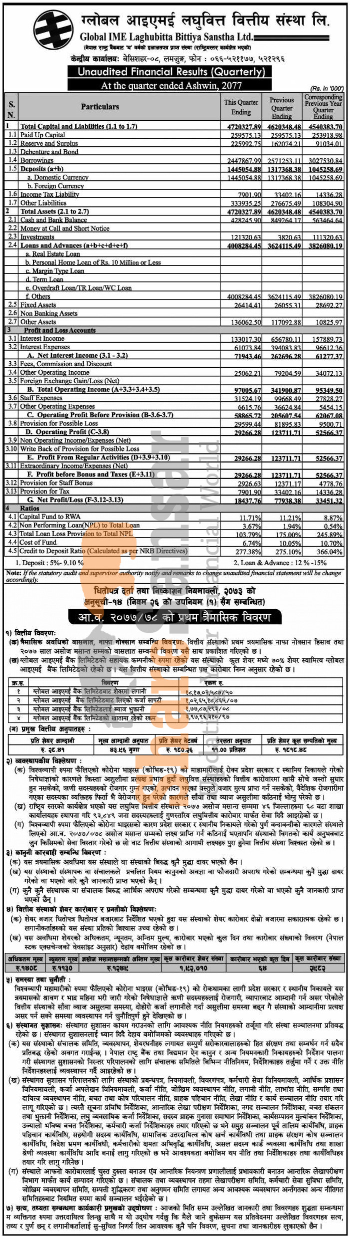 Global IME Laghubitta Bittiya Sanstha Limited has posted a net profit of Rs 18.43 million and published its 1st quarter company analysis of the fiscal year 2077/78.