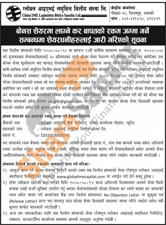 Global IME Laghubitta Bittiya Sanstha Limited has urged its shareholders to pay tax amount for 28% bonus share distribution purposes.
