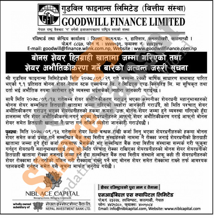 Goodwill Finance Company Limited has distributed 9.1% bonus share directly to DEMAT accounts and urged its shareholders to dematerialize their shares.