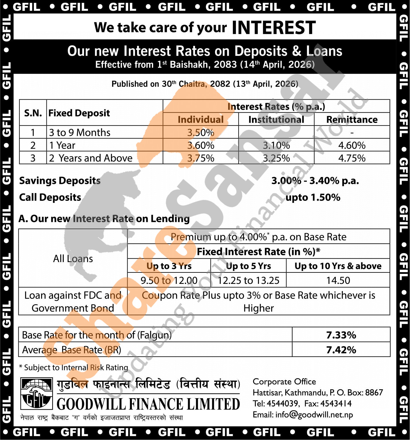 Goodwill Finance Company Limited has published a notice regarding the new interest rate for deposit and loan products and it's effective from 1st Baisakh, 2083.