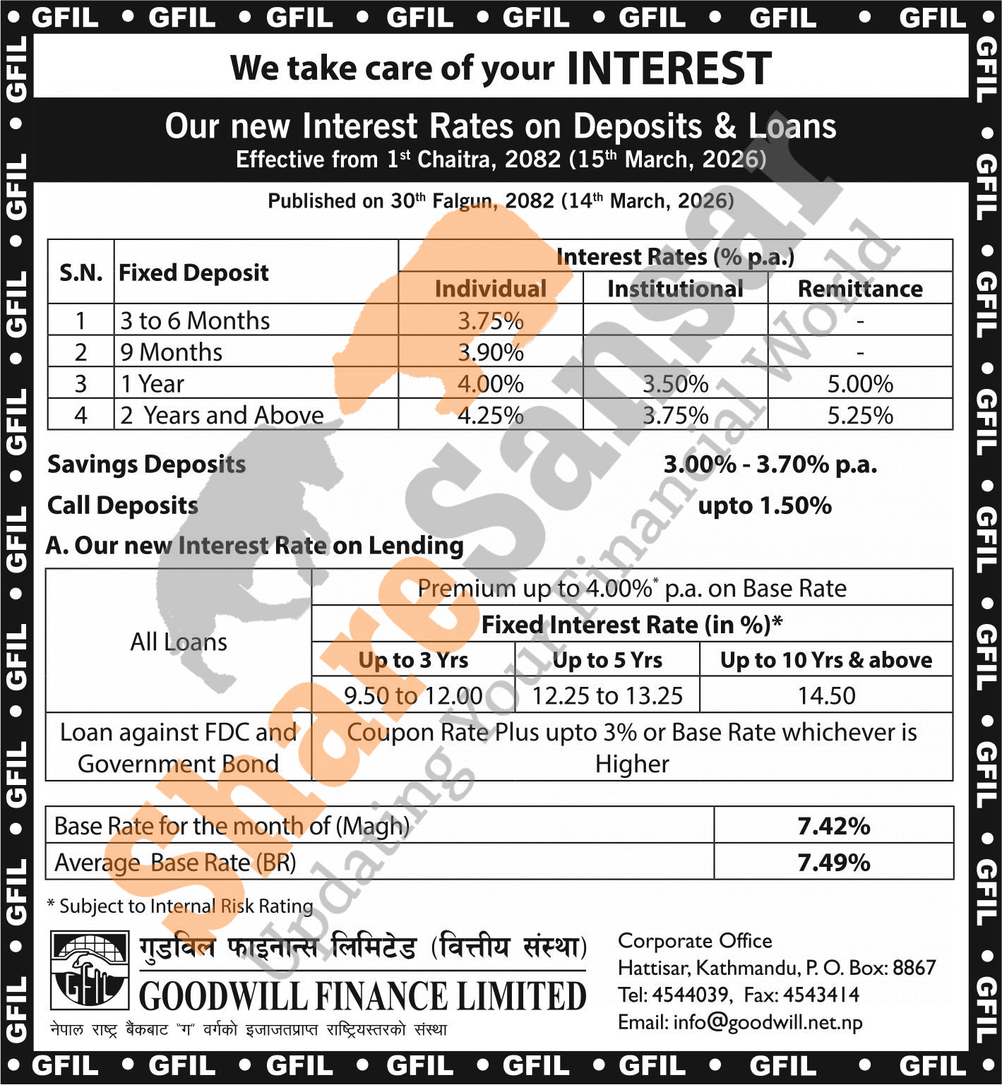 Goodwill Finance Company Limited has published a notice regarding the new interest rate for deposit and loan products and it's effective from 1st Chaitra, 2082.