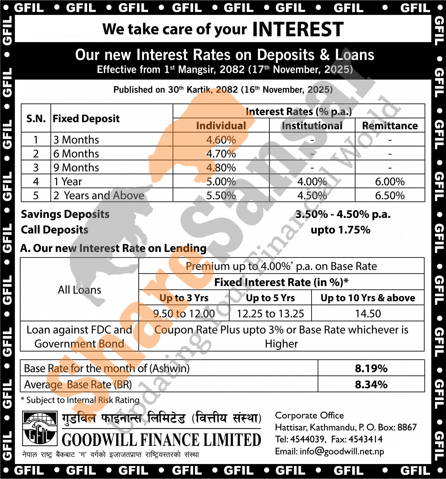 Goodwill Finance Company Limited has published a notice regarding the new interest rate for deposit and loan products and it's effective from 1st Mangsir, 2082.