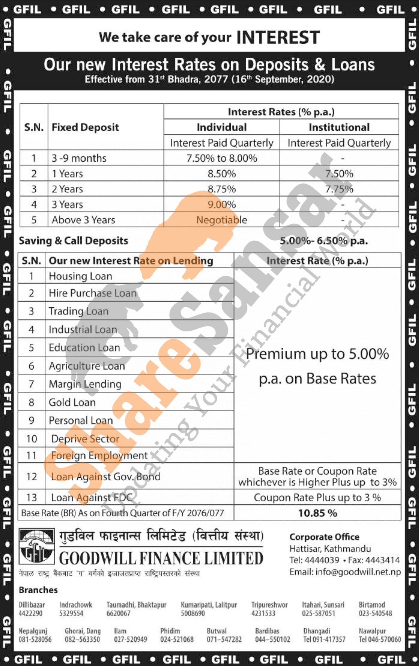Goodwill Finance Company Limited has published a notice regarding the new interest rate for its deposit and loan product and its effective from 1st Ashwin, 2077.