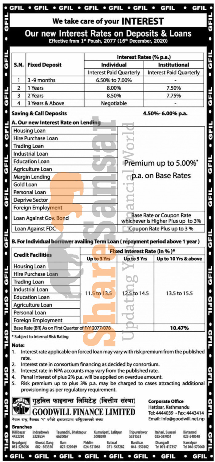 Goodwill Finance Company Limited has published a notice regarding the new interest rate for its deposit and loan products and it's effective from 1st Poush, 2077.