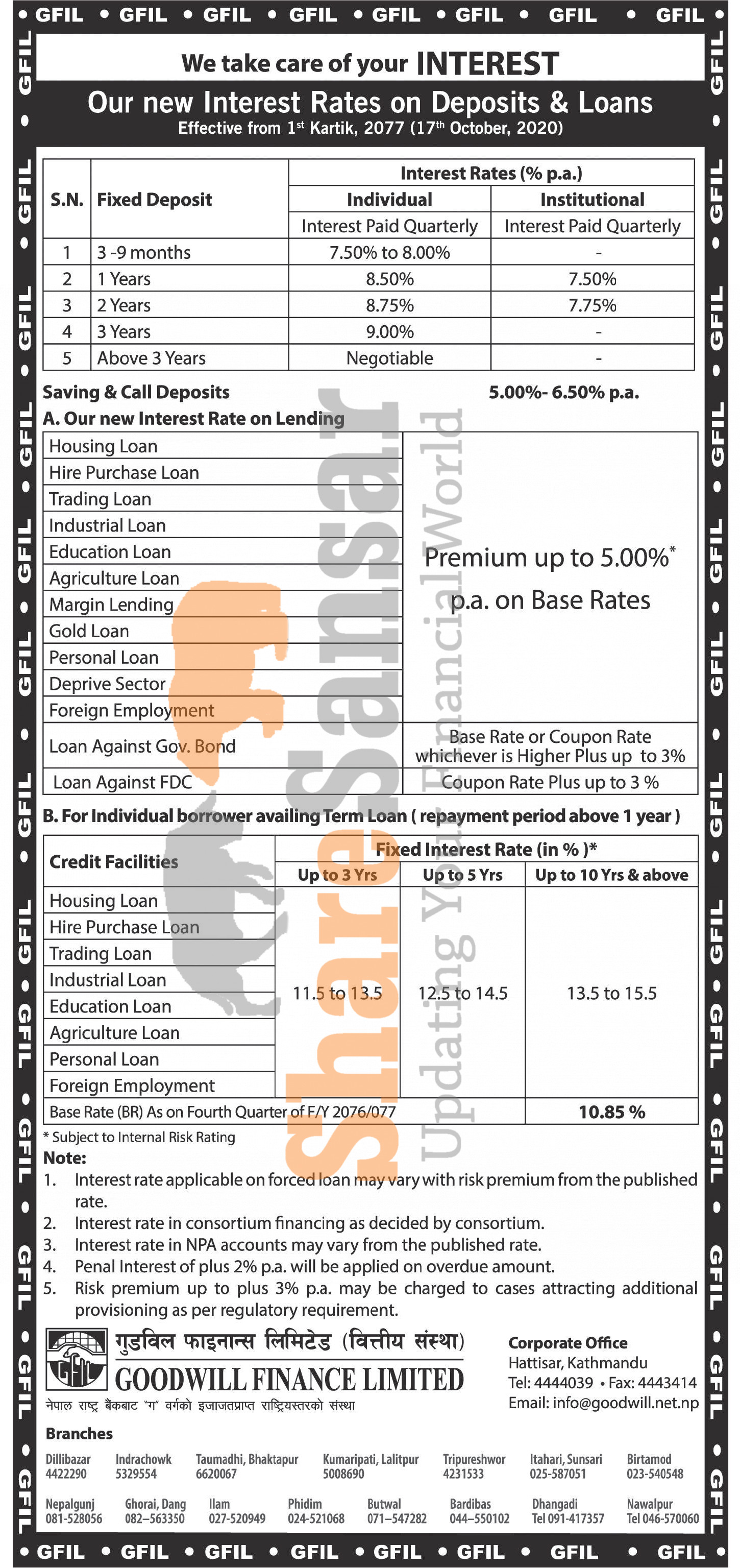 Goodwill Finance Company Limited has published a notice regarding the new interest rate for its loan and deposit products and it's effective from 1st Kartik, 2077.