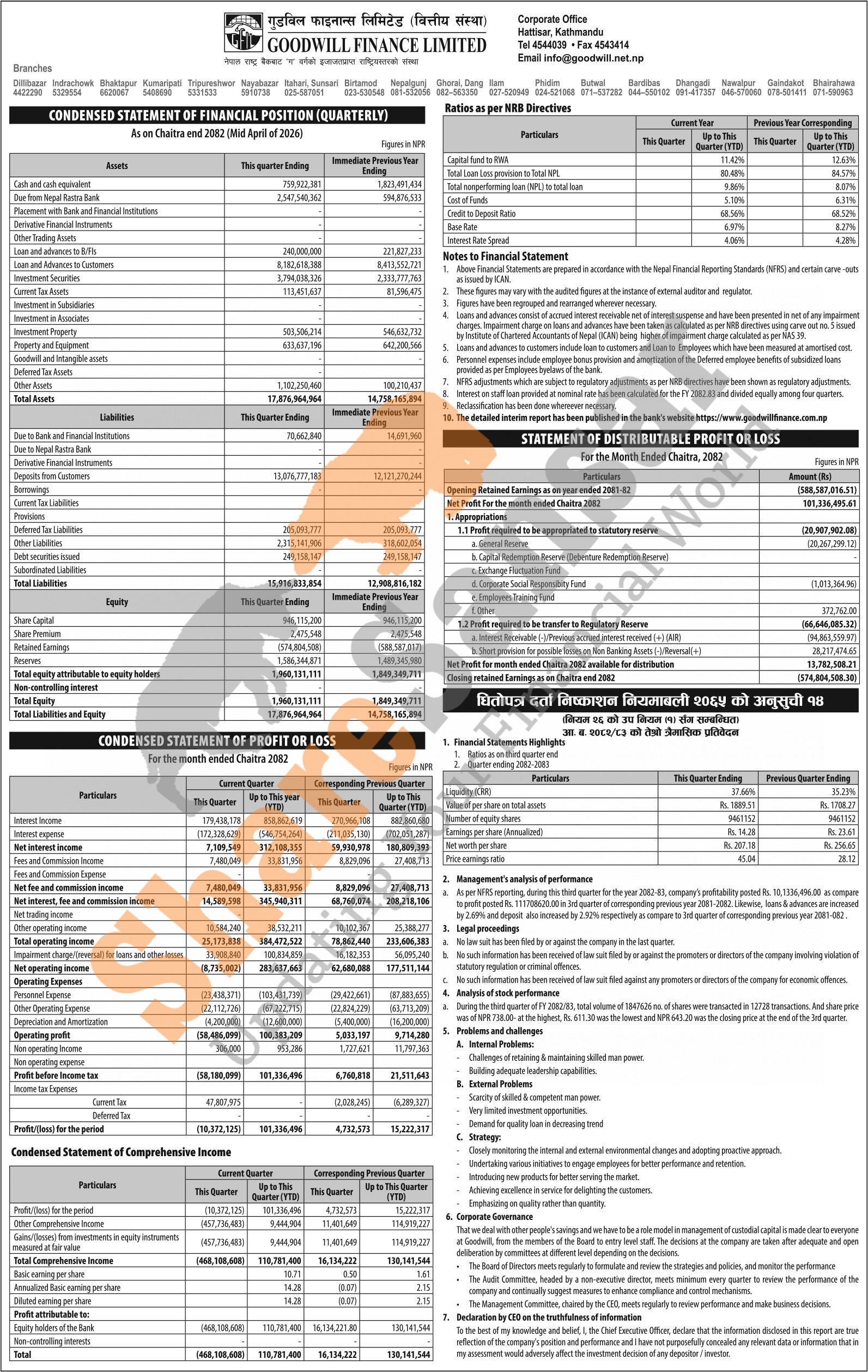 Goodwill Finance Limited has posted a net profit of Rs 101.33 million and published its 3rd quarter company analysis of the fiscal year 2082/83.