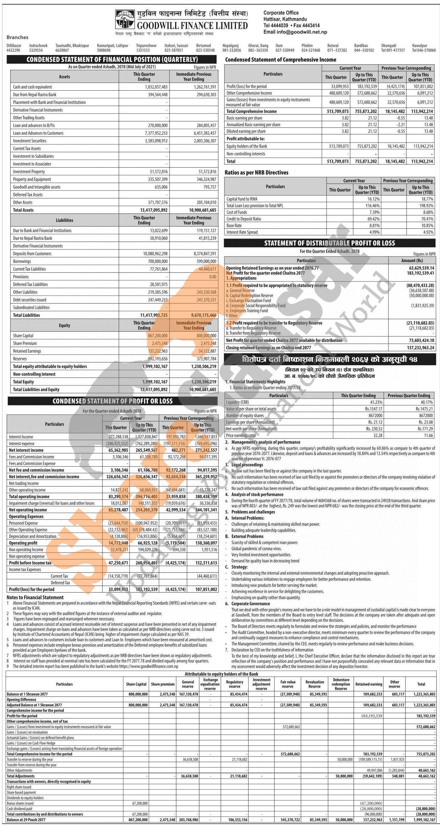 Goodwill Finance Limited has posted a net profit of Rs 183.19 million and published its 4th quarter company analysis of the fiscal year 2077/78.