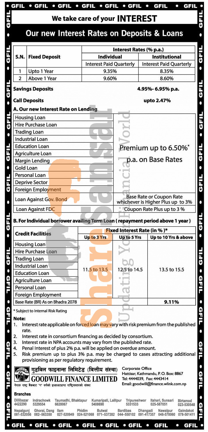 Goodwill Finance Limited has published a notice regarding new revised interest rate for the month of Kartik.