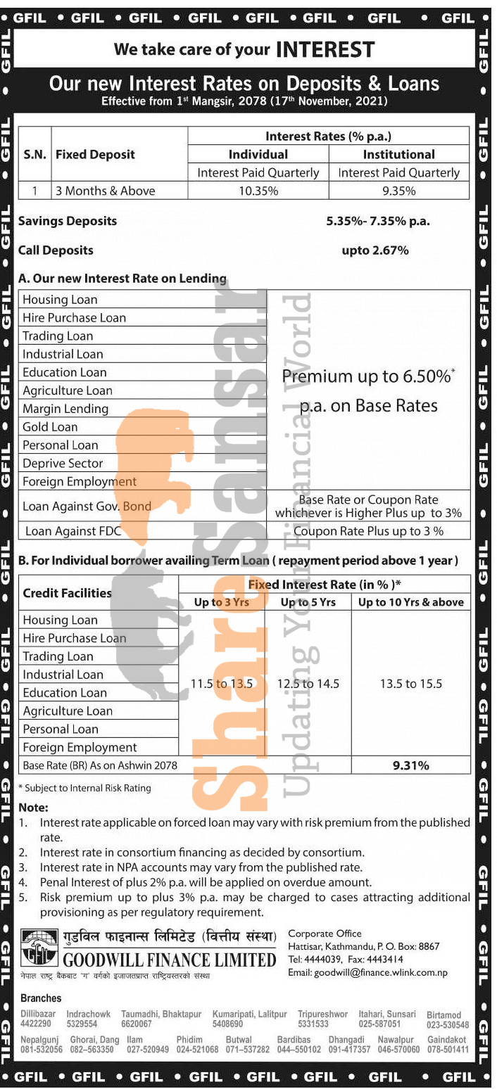 Goodwill Finance Limited has published a notice regarding the new interest rate for its deposit and loan products and it's effective from 1st Mangshir, 2078.