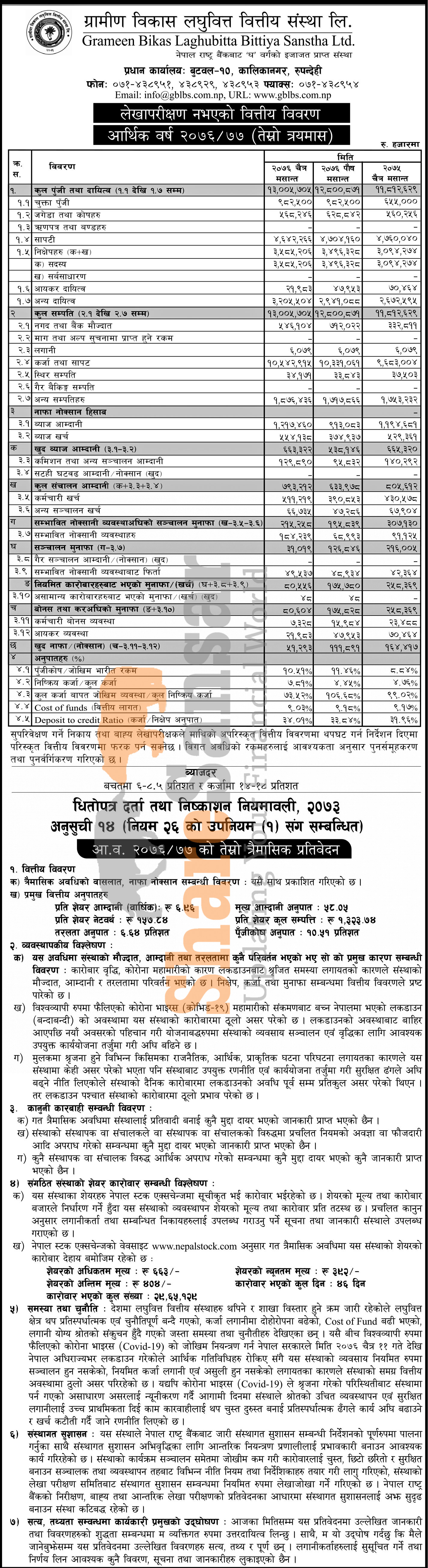 Grameen Bikas Laghubitta Bittiya Limited has posted a net profit of Rs 51.29 million and published its 3rd quarter company analysis of the fiscal year 2076/77.