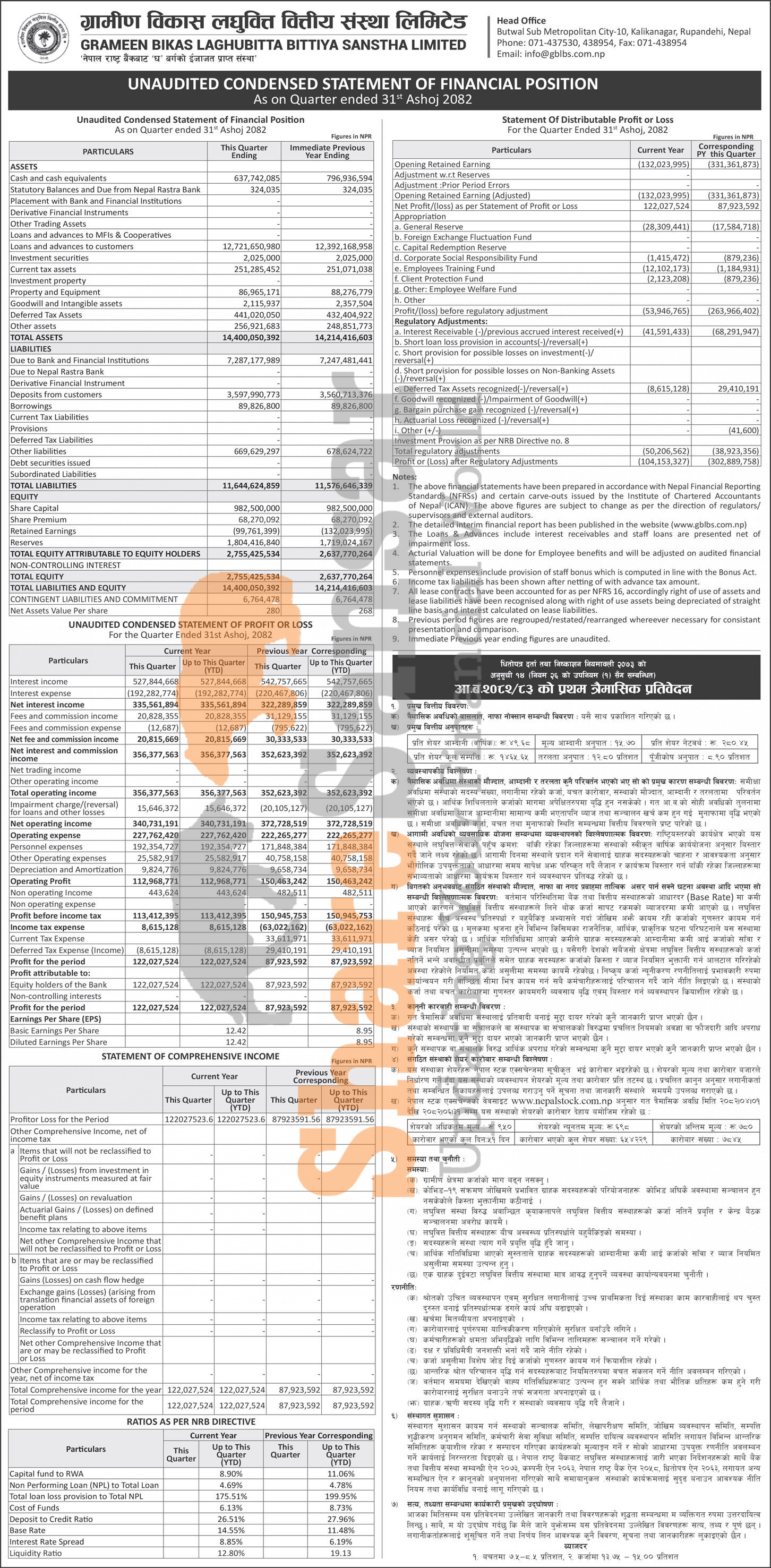 Grameen Bikas Laghubitta Bittiya Sanstha Limited has posted a net profit of Rs 122.02 million and published its 1st quarter company analysis of the fiscal year 2082/83.