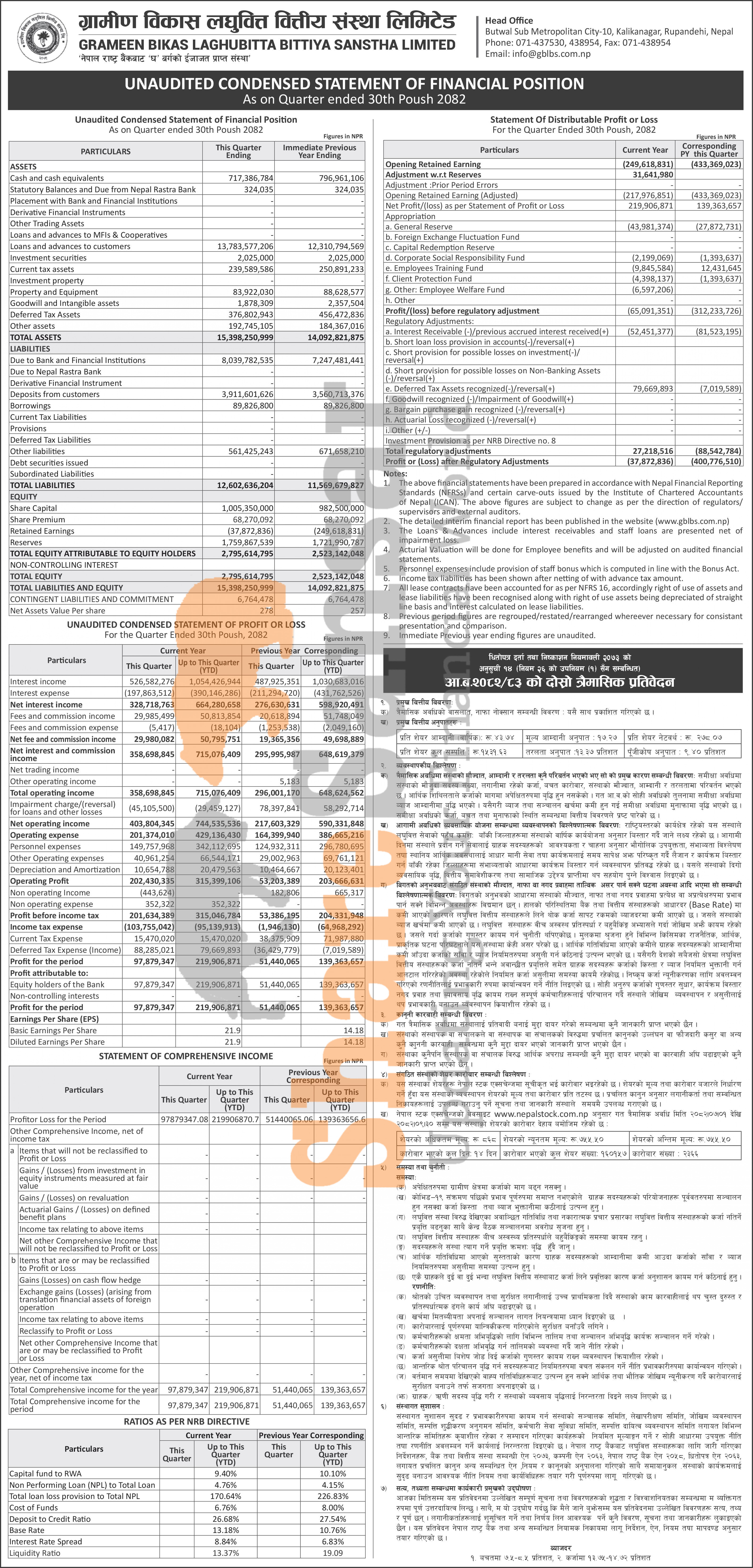 Grameen Bikas Laghubitta Bittiya Sanstha Limited has posted a net profit of Rs 219.90 million and published its 2nd quarter company analysis of the fiscal year 2082/83.
