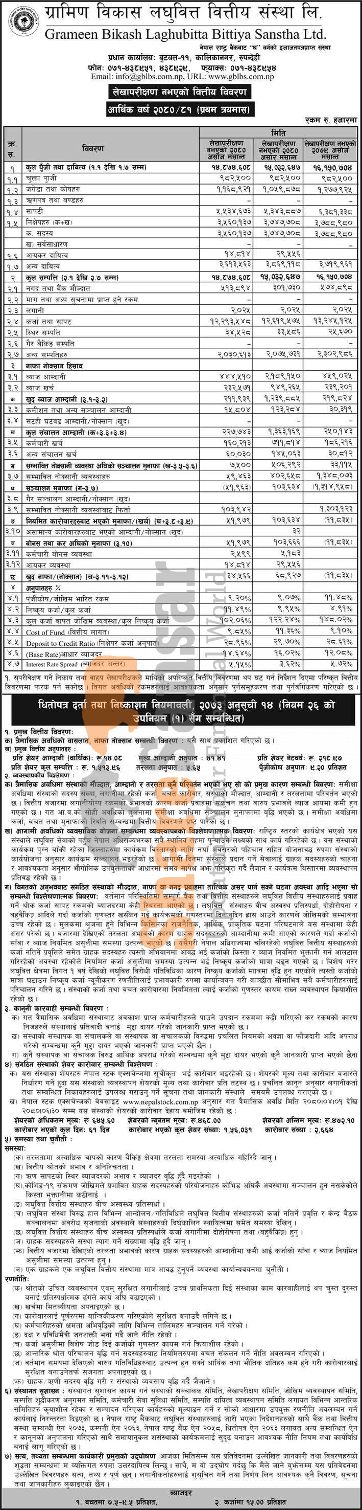 Grameen Bikas Laghubitta Bittiya Sanstha Limited has posted a net profit of Rs 34.56 million during the 1st quarter of the fiscal year 2080/81.