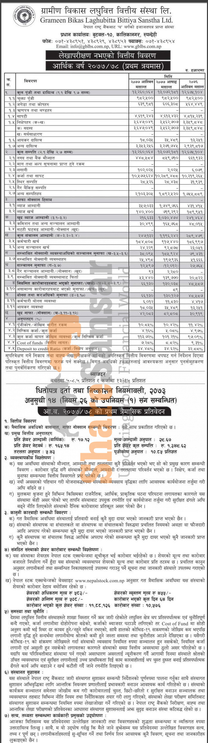 Grameen Bikas Laghubitta Bittiya Sanstha Limited has posted a net profit of Rs 42.08 million and published its 1st quarter company analysis of the fiscal year 2077/78.