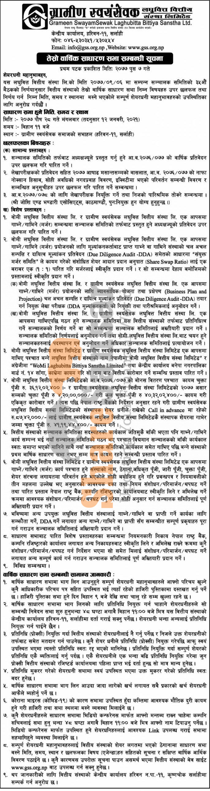 Grameen Swayamsebak Laghubitta Bittiya Sanstha Limited has announced its 3rd AGM going to be held on 28th Poush, 2077.