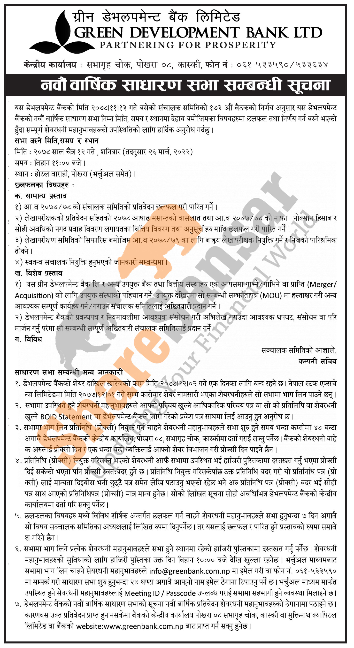 Green Development Bank Limited has announced its 9th AGM going to be held on 12th Chaitra, 2078.