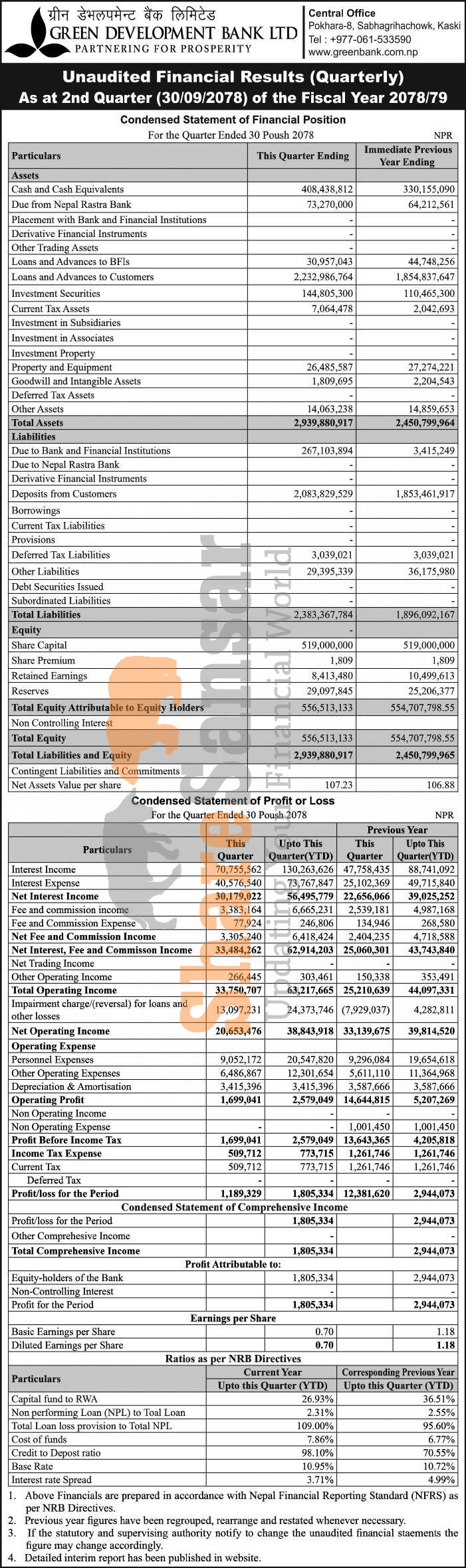 Green Development Bank Limited has posted a net profit of Rs 1.80 million during the 2nd quarter of the fiscal year 2078/79.