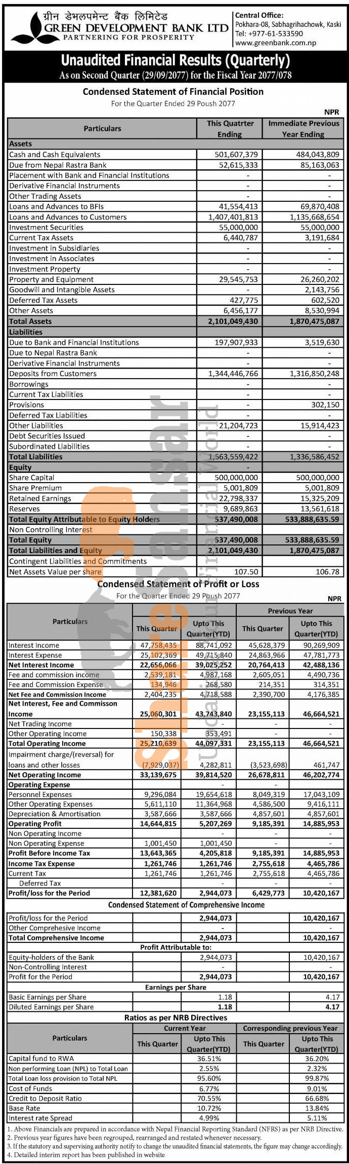 Green Development Bank Limited has posted a net profit of Rs 2.94 million during the 2nd quarter of the fiscal year 2077/78.