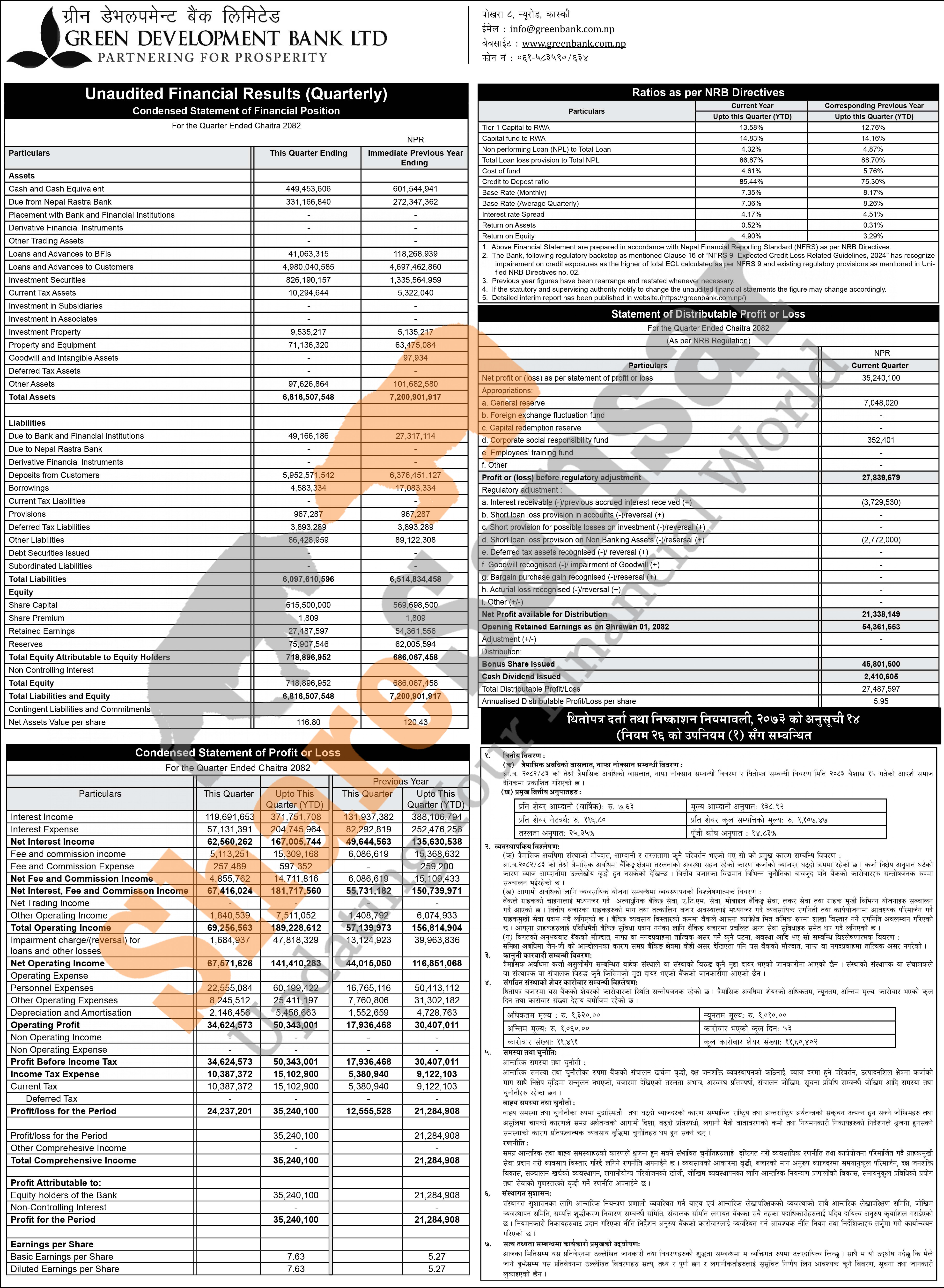Green Development Bank Limited has posted a net profit of Rs 35.24 million and published its 3rd quarter company analysis of the fiscal year 2082/83.