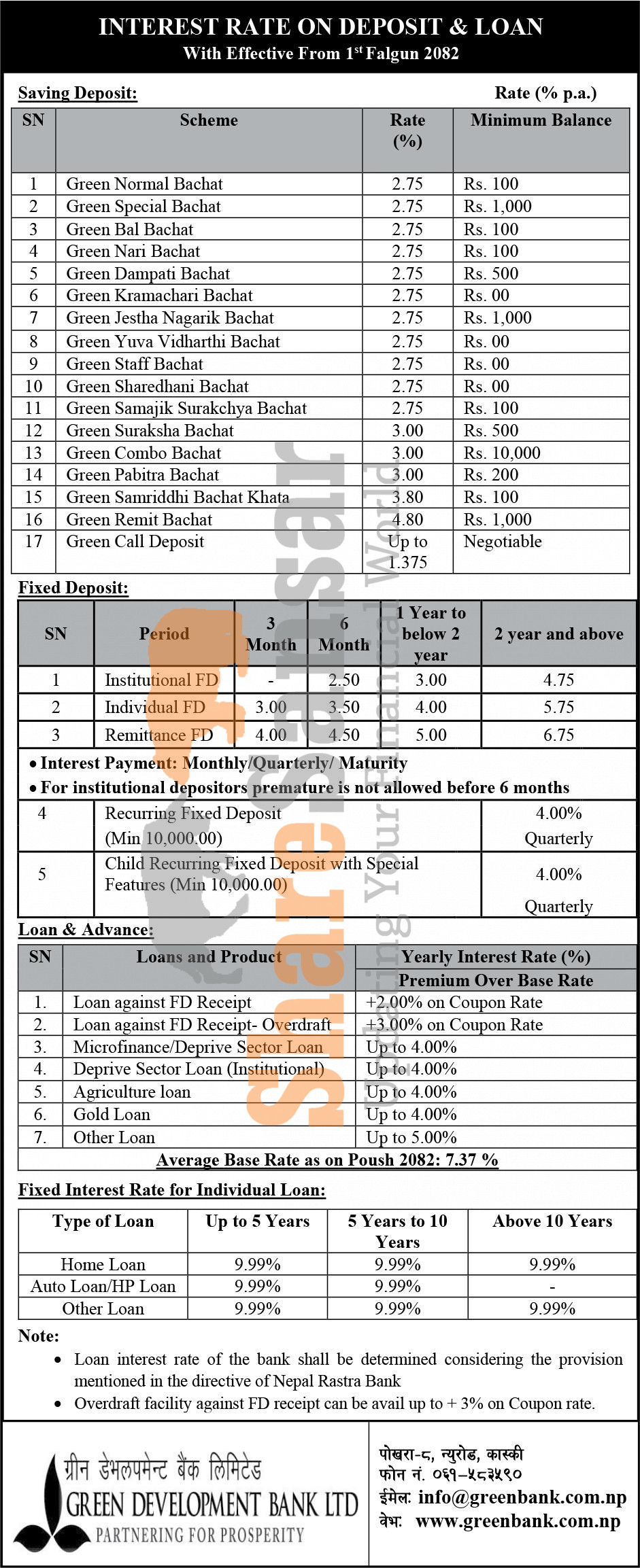 Green Development Bank Limited has published a notice regarding the new interest rate for deposit and loan products and it's effective from 1st Falgun, 2082.