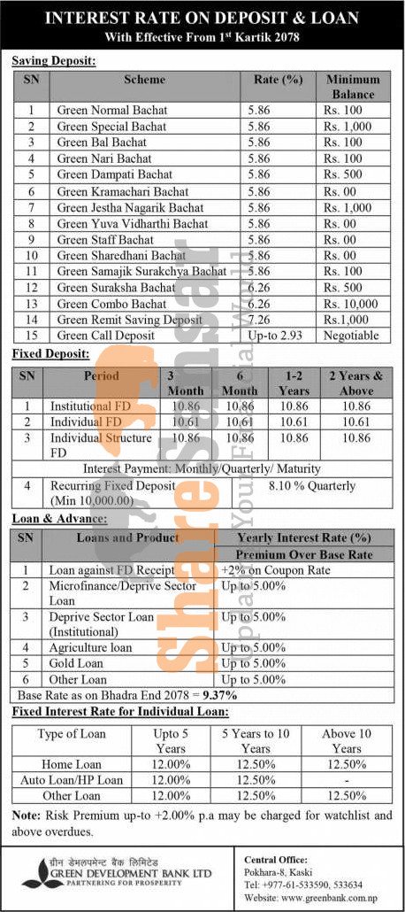 Green Development Bank Limited has published a notice regarding the new interest rate for deposit and loan products and it's effective from 1st Kartik, 2078.
