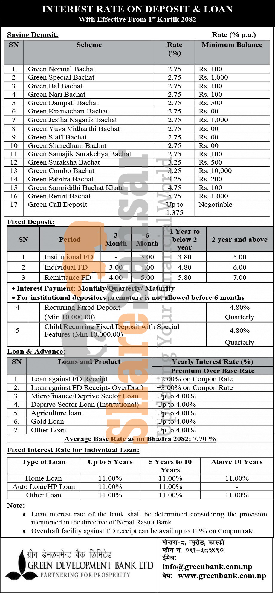 Green Development Bank Limited has published a notice regarding the new interest rate for deposit and loan products and it's effective from 1st Kartik, 2082.