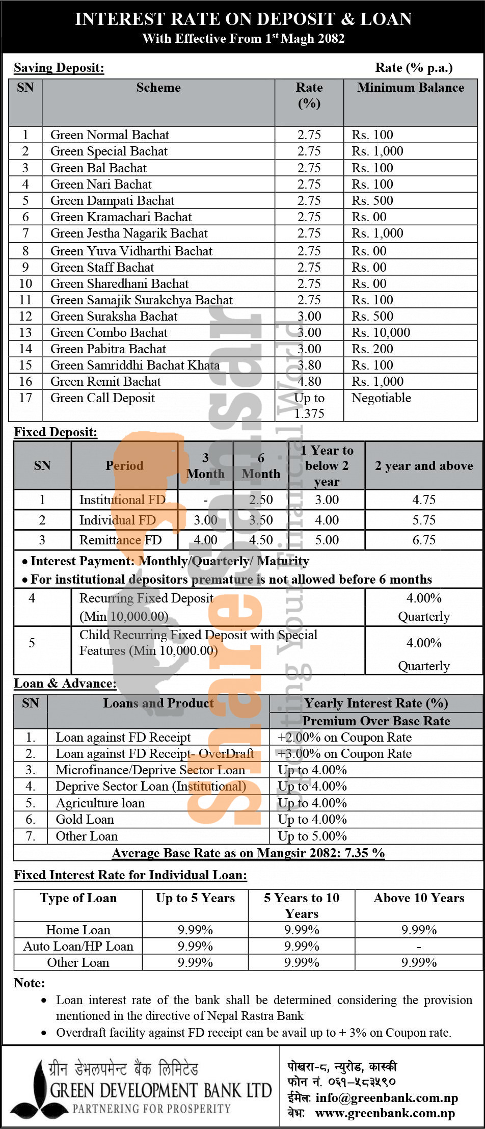 Green Development Bank Limited has published a notice regarding the new interest rate for deposit and loan products and it's effective from 1st Magh, 2082.