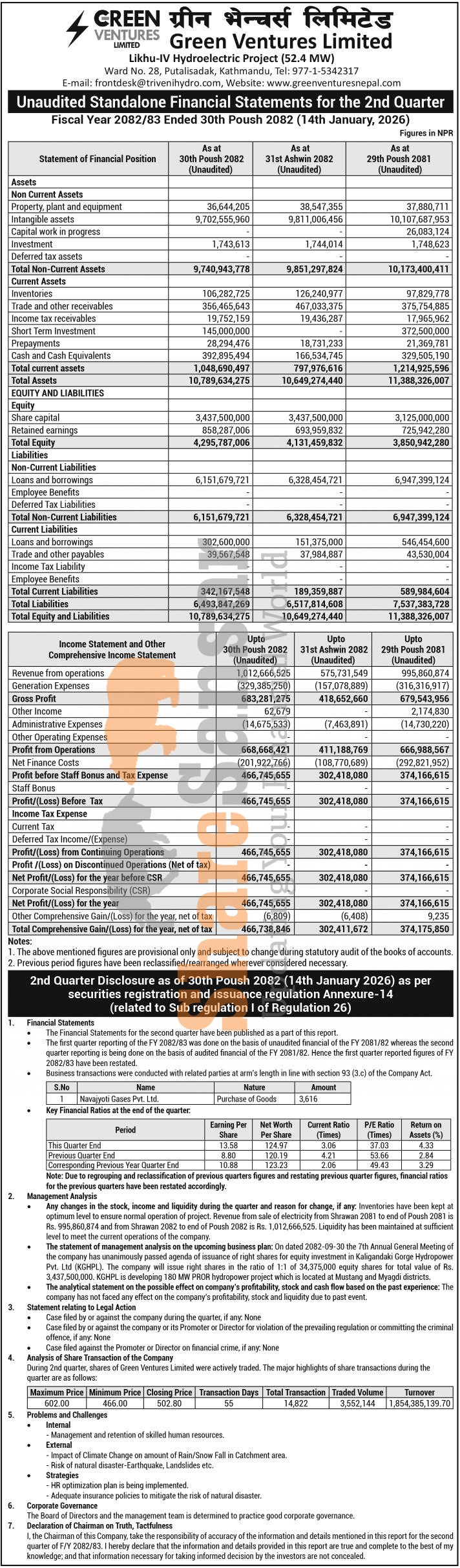 Green Ventures Limited has posted a net profit of Rs 466.74 million and published its 2nd quarter company analysis of the fiscal year 2082/83.