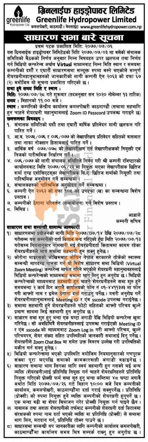 Greenlife Hydropower Limited has announced its 10th and 11th AGM going to be held on 28th Kartik, 2077.