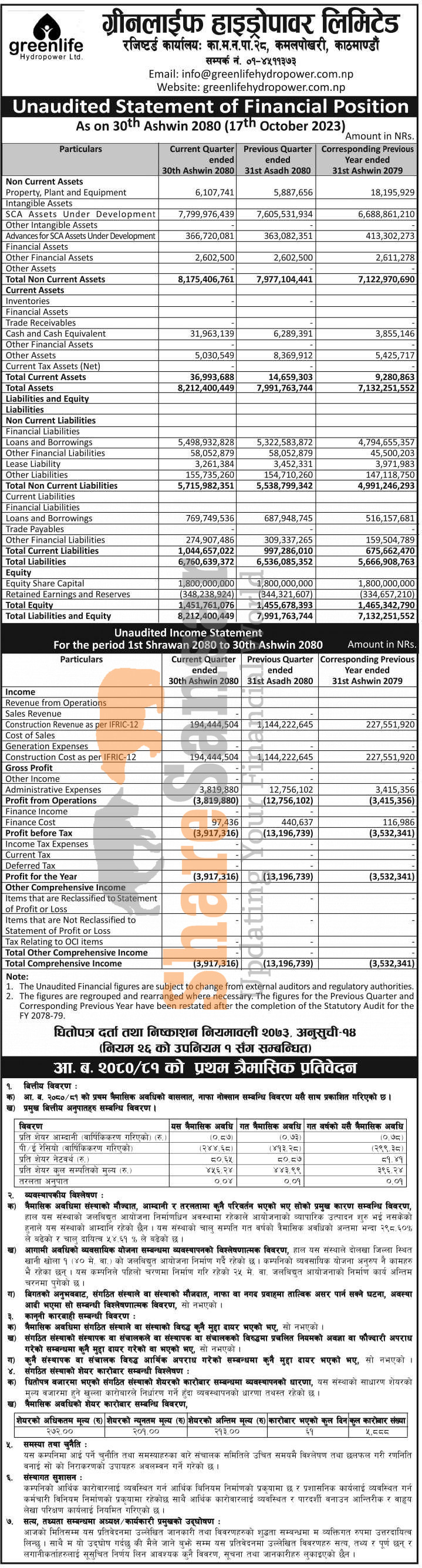Greenlife Hydropower Limited has posted a net loss of Rs 3.91 million and published its 1st quarter company analysis of the fiscal year 2080/81.