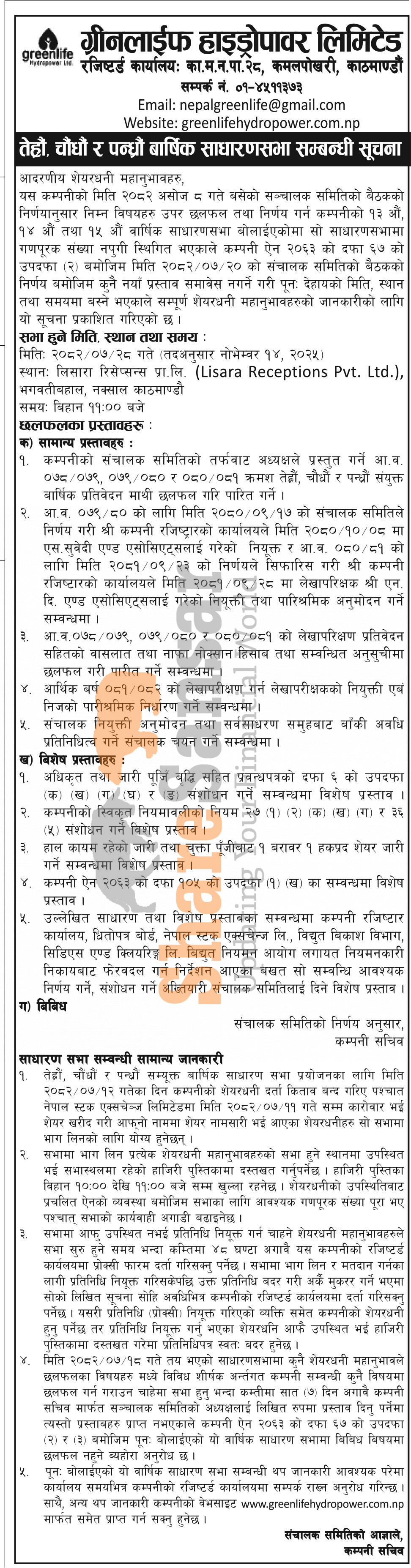 Greenlife Hydropower Limited has postponed its 13th, 14th and 15th AGM date to 28th Kartik, 2082.