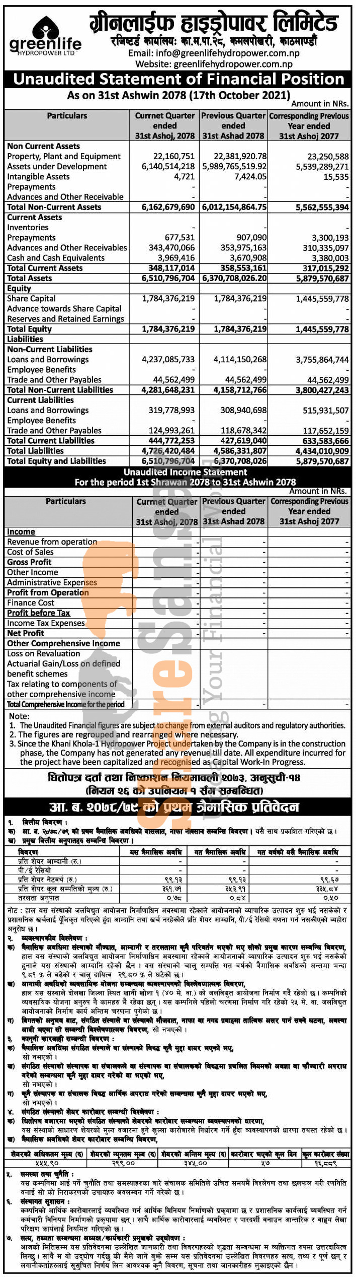 Greenlife Hydropower Limited has published its 1st quarter financial statement of the fiscal year 2078/79.