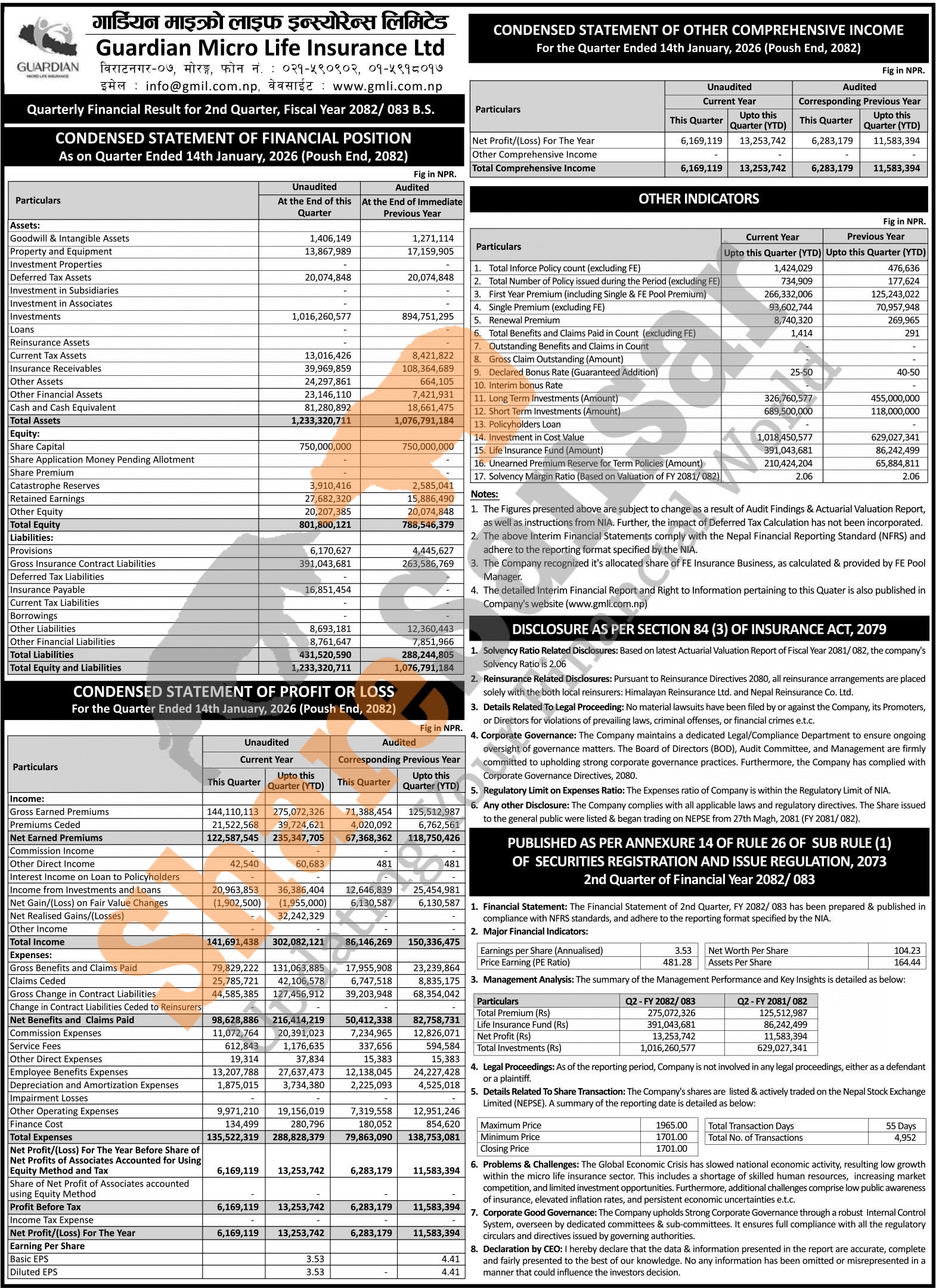 Guardian Micro Life Insurance Limited has posted a net profit of Rs 13.25 million and published its 2nd quarter company analysis of the fiscal year 2082/83.