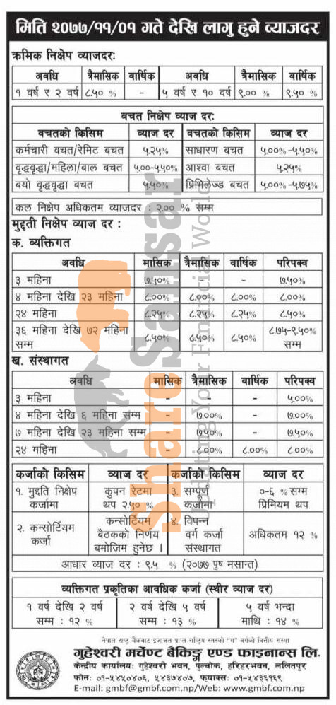 Guheswori Merchant Banking and Finance Limited has published a notice regarding the new interest rate for deposit and loan products and it's effective from 1st Falgun, 2077.