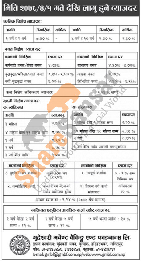 Guheswori Merchant Banking and Finance Limited has published a notice regarding the new interest rate for deposit and loan products and it's effective from 1st Shrawan, 2078.