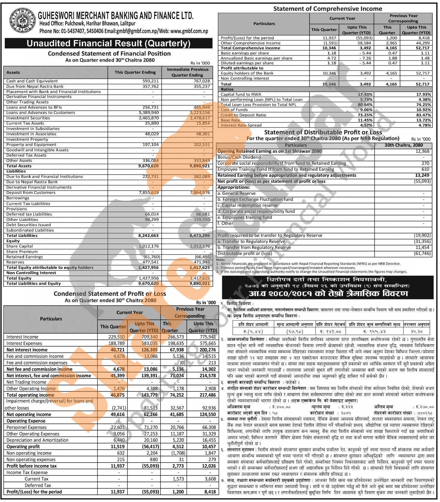 Guheswori Merchant Banking & Finance Limited has posted a net loss of Rs 55.09 million and published its 3rd quarter company analysis of the fiscal year 2080/81.