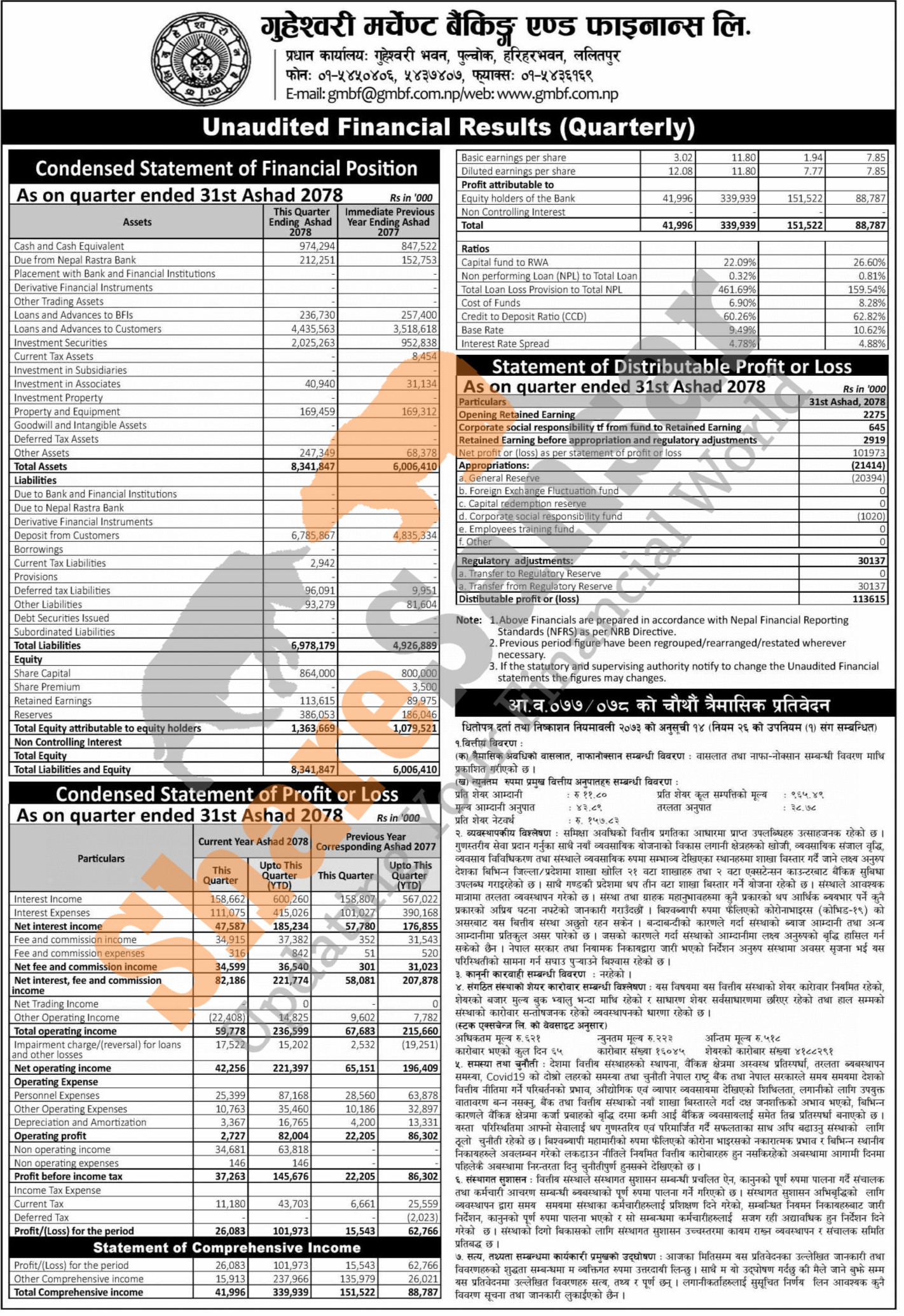 Guheswori Merchant Banking & Finance Limited has posted a net profit of Rs 101.97 million and published its 4th quarter company analysis of the fiscal year 2077/78.