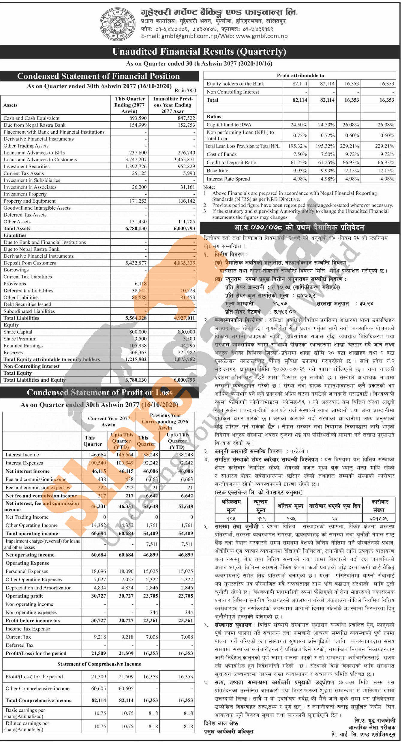 Guheswori Merchant Banking & Finance Limited has posted a net profit of Rs 21.5 million and published its 1st quarter company analysis of the fiscal year 2077/78.