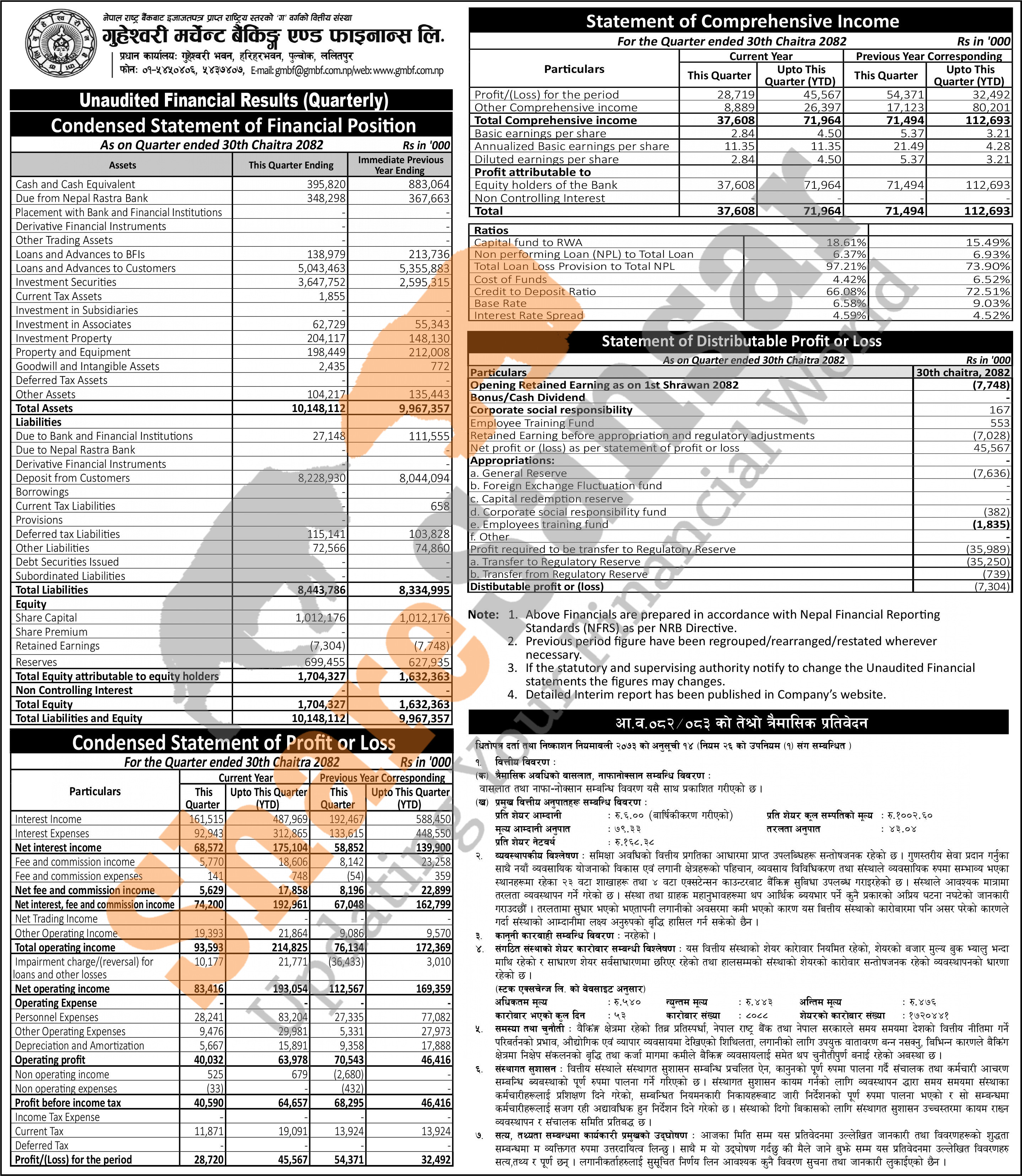 Guheswori Merchant Banking & Finance Limited has posted a net profit of Rs 45.56 million and published its 3rd quarter company analysis of the fiscal year 2082/83.