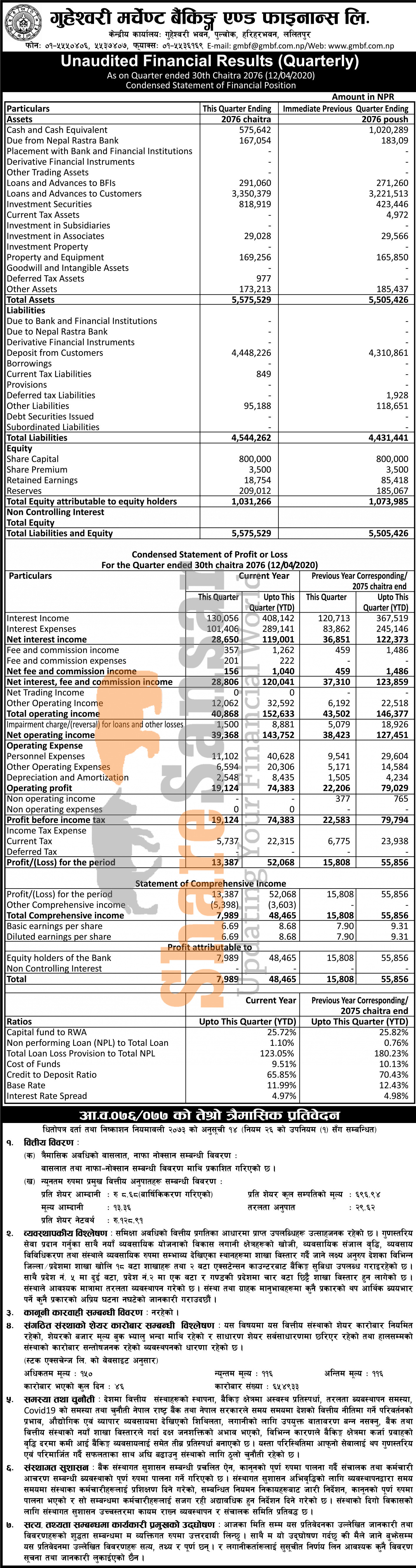 Guheswori Merchant Banking & Finance Limited has posted a net profit of Rs 52.06 million and published its 3rd quarter company analysis of the fiscal year 2076/77.