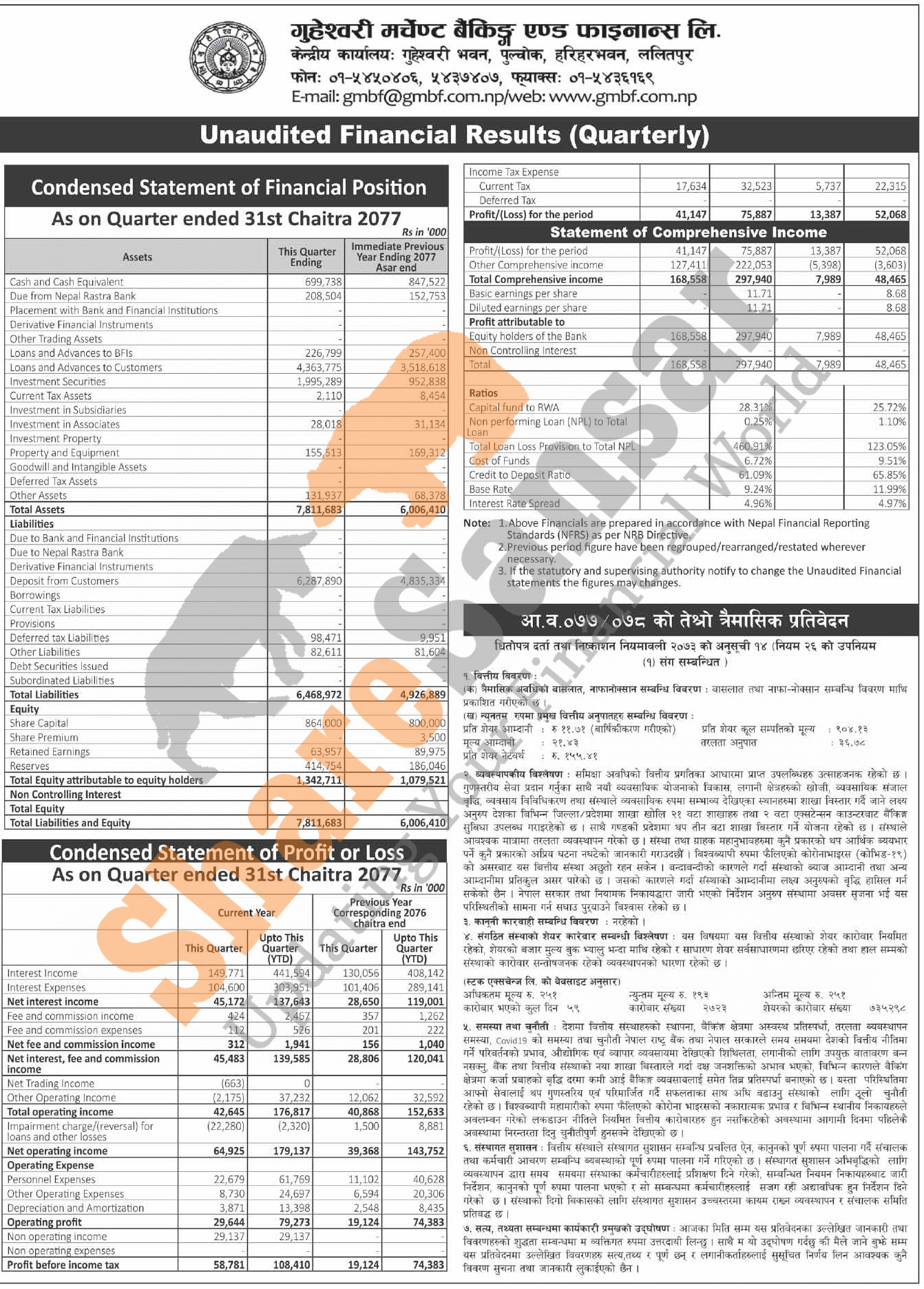 Guheswori Merchant Banking & Finance Limited has posted a net profit of Rs 75.88 million and published its 3rd quarter company analysis of the fiscal year 2077/78.