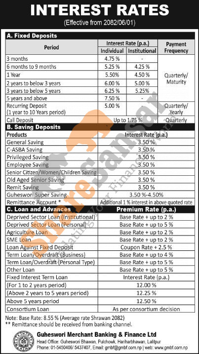 Guheswori Merchant Banking & Finance Limited has published a notice regarding the new interest rate for deposit and loan products and it's effective from 1st Ashwin, 2082.