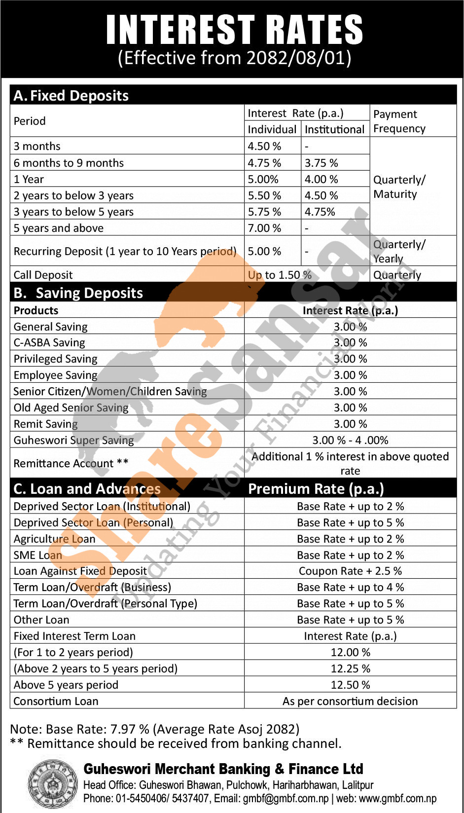 Guheswori Merchant Banking & Finance Limited has published a notice regarding the new interest rate for deposit and loan products and it's effective from 1st Mangsir, 2082.
