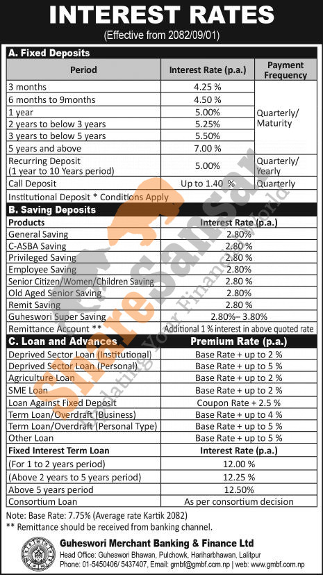 Guheswori Merchant Banking & Finance Limited has published a notice regarding the new interest rate for deposit and loan products and it's effective from 1st Poush, 2082.