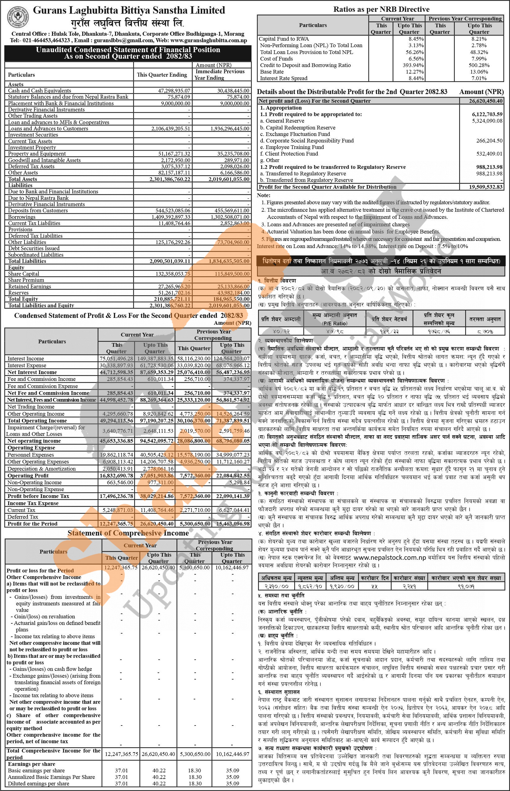 Gurans Laghubitta Bittiya Sanstha Limited has posted a net profit of Rs 26.62 million and published its 2nd quarter company analysis of the fiscal year 2082/83.