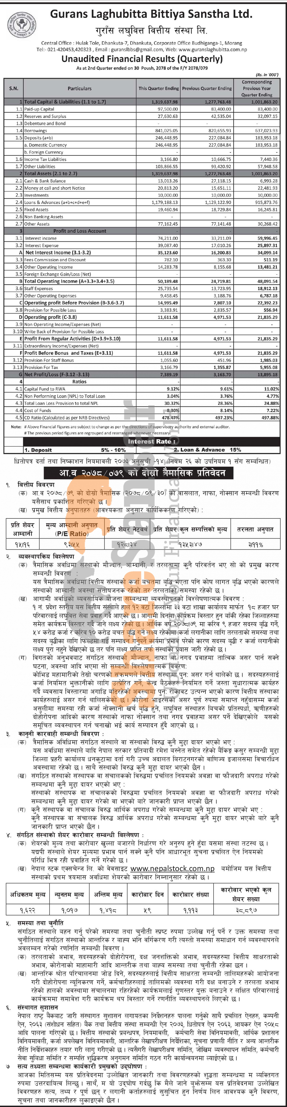 Gurans Laghubitta Bittiya Sanstha Limited has posted a net profit of Rs 7.38 million and published its 2nd quarter company analysis of the fiscal year 2078/79.
